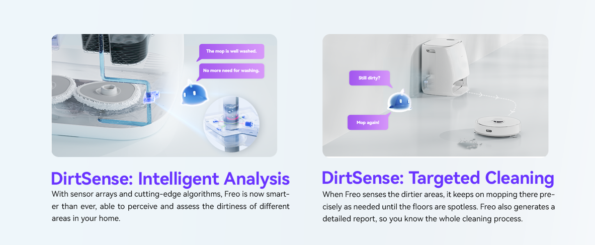 Dirtsense Ultra Clean: Utilizing Dirtsense technology, the Freo intelligently detects the dirtiness of mop pads and sanitizes them using high-speed spinning with the precise amount of water mixed with a scientifically formulated floor cleaner.