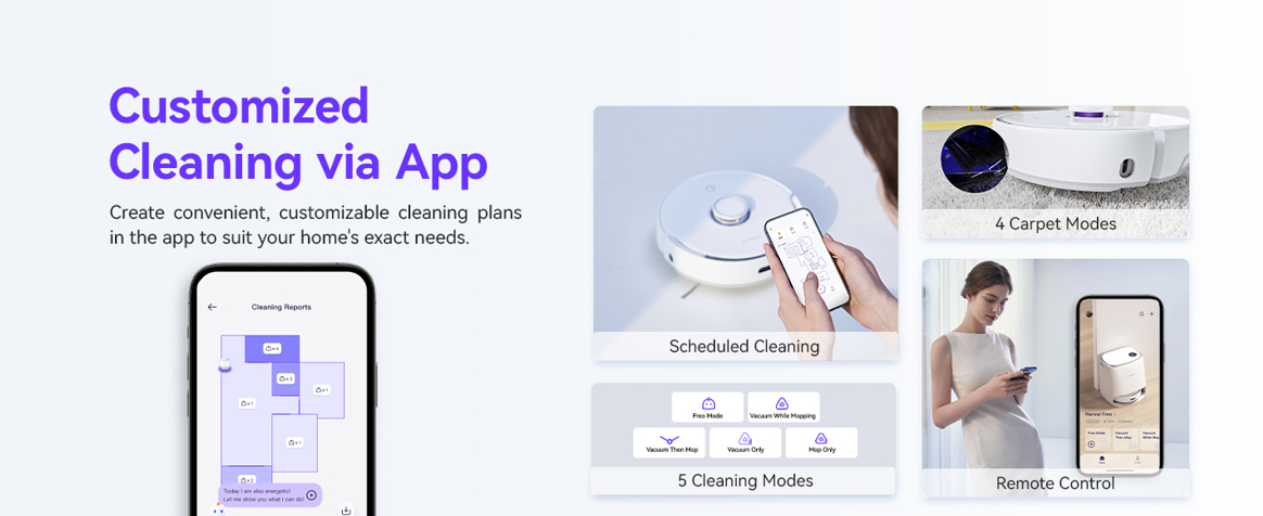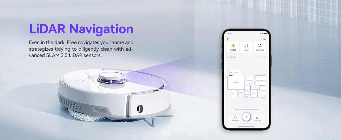 Freo Mode: Transitioning from hands-free to mind-free cleaning, the Freo robot vacuum and mop combo makes optimal cleaning decisions and actions under Freo Mode, redefining auto-cleaning logic in your life.